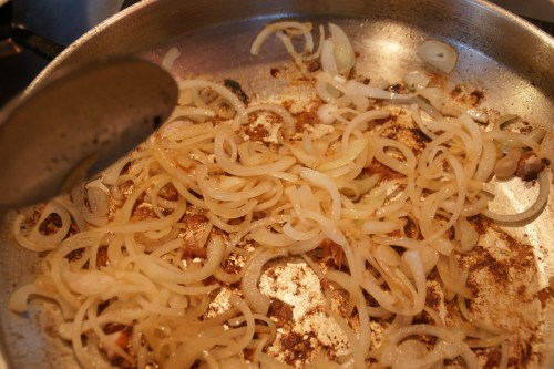Then I added a bit more oil and browned the chicken thighs. See how there are bits stuck to the pan– those sticky bits are fond (another French term that means “base,” and it’s truly the flavor base for this dish).