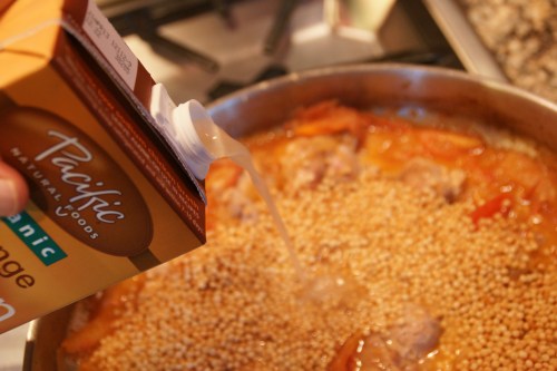 Finally, I tossed in the toasted couscous and added the chicken stock (not my own and I wondered if Kurt would notice). I mixed everything a bit to get the couscous into the liquid, added some salt, brought the liquid to a simmer then clamped a lid on and waited. I probably stirred it two or three times.