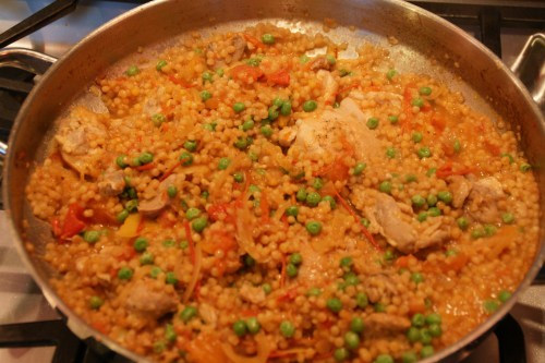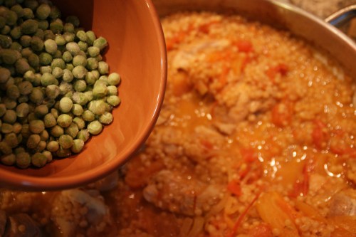 When the couscous was tender and the chicken cooked through, in went the peas to heat through.
