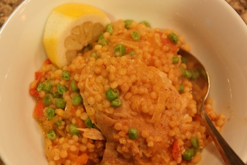 I found another winning dish while searching for recipes that use Israeli couscous. On a whim, I had picked up a box at Trader Joe’s and figured that since we all liked regular couscous, this could be a new pasta addition. The recipe I selected was by Martha Stewart– you can find it here. Like the white chicken chili, the success of this dish, which has none of the cream components my guys love, is the texture of the big Israeli couscous pearls and the high flavor profile of lemon and saffron.