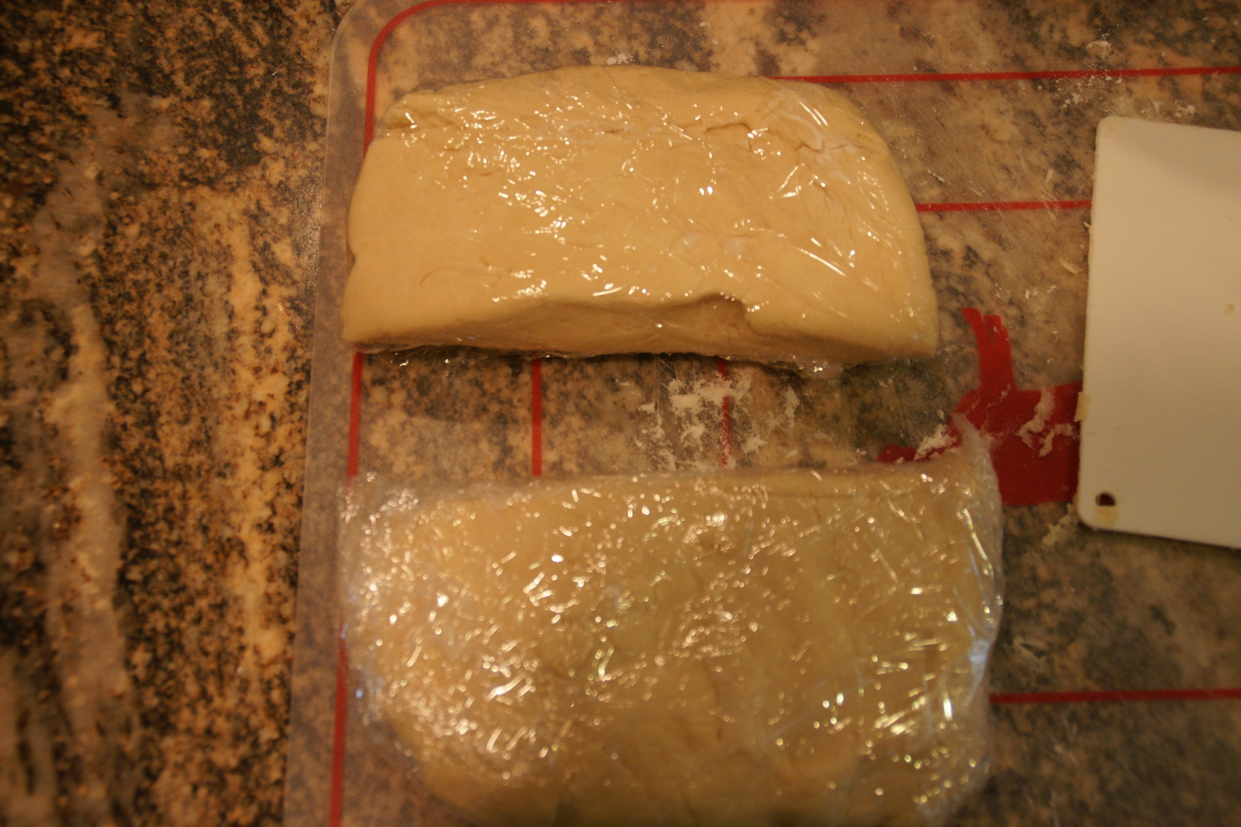 Divide dough into two pieces, wrap in plastic wrap and refrigerate for two hours.