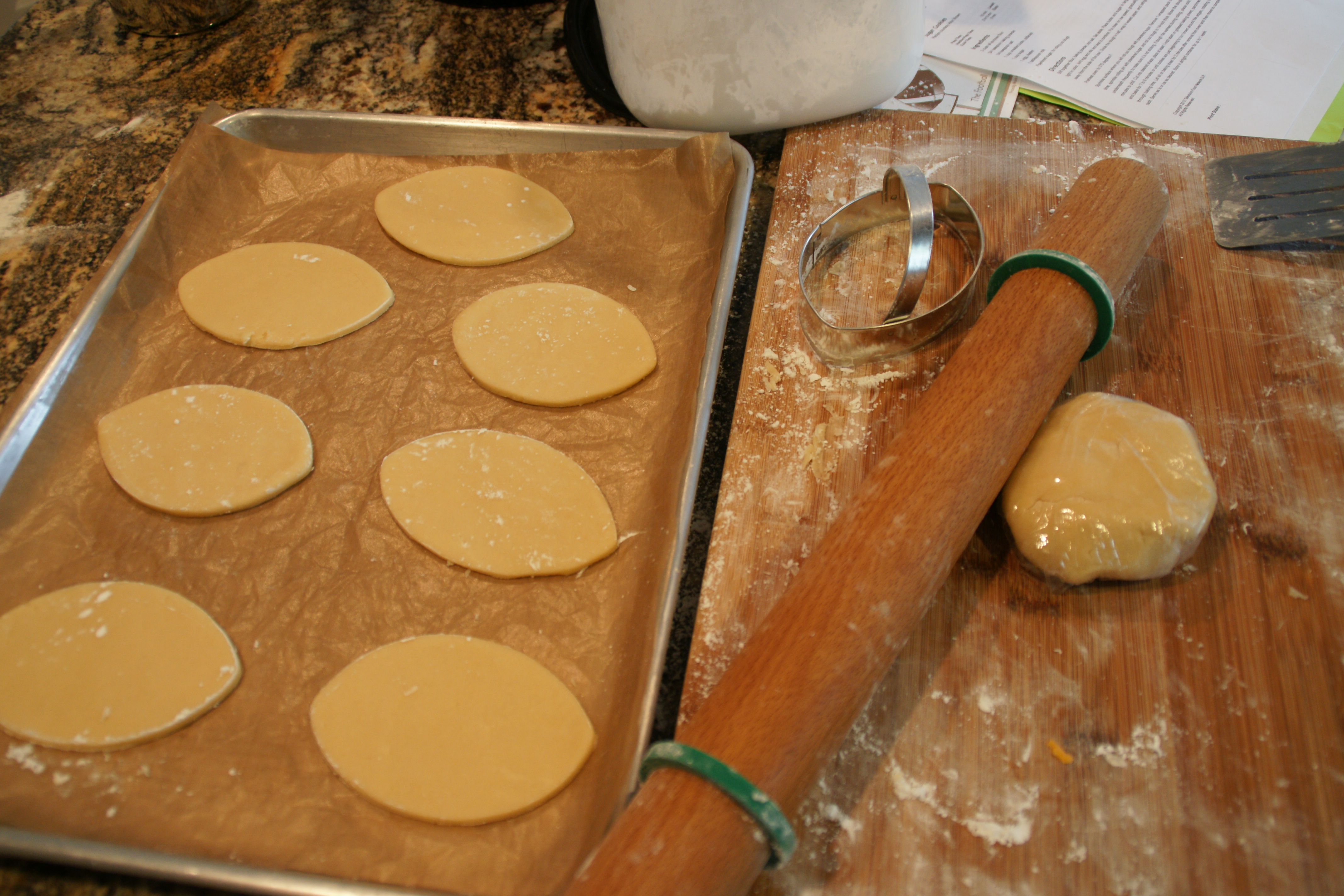 Time to roll out the dough, using powdered sugar instead of flour; this prevents the cookie from being too tough.  Move the dough around periodically to make sure it’s not sticking to your surface– use that powdered sugar liberally, and don’t forget the rolling pin!  Note: If you use powdered sugar this way, you must use parchment or thin silicone sheets to line your cookie sheets or the excess sugar on the cookies will cement them to the baking sheet.  Trust me.  I have had my share of bowls of “cookie crumbles” that became ice cream topping.  I now line my sheets re-usable thin silicone sheets.  I love them!