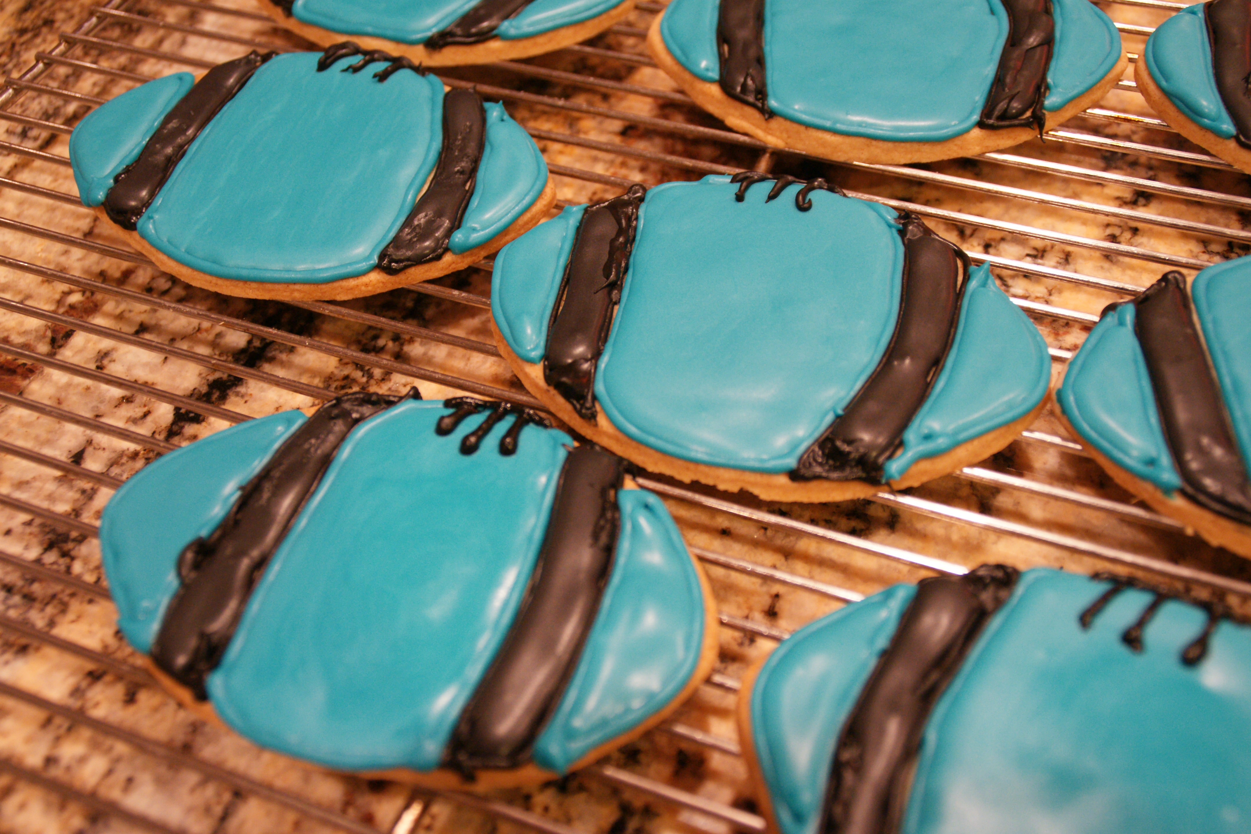 Decorating.  Clearly, the finished products substantiate the fact that I have not done any color flow or royal icing work in 25 years.  Thank goodness Matthew is a kid and will likely not notice the multiple defects…  Ken (“I need to make sure they taste good!”) said they were “wonderful,” and that “Matthew will LOVE them.”   When I said there were a lot of decorating defects, he looked at me like I had two heads.