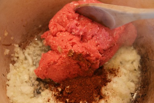 You’re not trying to brown the meat, just get it partially cooked before you simmer it with the remaining seasonings and tomato sauce. I find this odd because BROWN=FLAVOR, and if you’ve ever made your own ragu (bolognese!), you seriously brown the hell out of the meat and veg. So, I guess it’s a Cincinnati thing, or maybe a Greek vs. Italian thing since the Cincinnati chili has its roots in Greek cooking. I do add a bit of salt and pepper, though it’s not called for in the recipe. I’m entrenched in the “season along the way” approach to cooking; for my family, it’s the difference between seasoned food and just plain salty food!