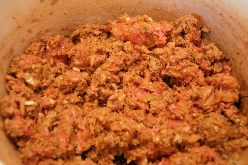 I took the tip off the website from a reviewer to additionally process the ground beef so it is finer and more “traditional.” Since I was using a food processor, I chopped the onions first:
