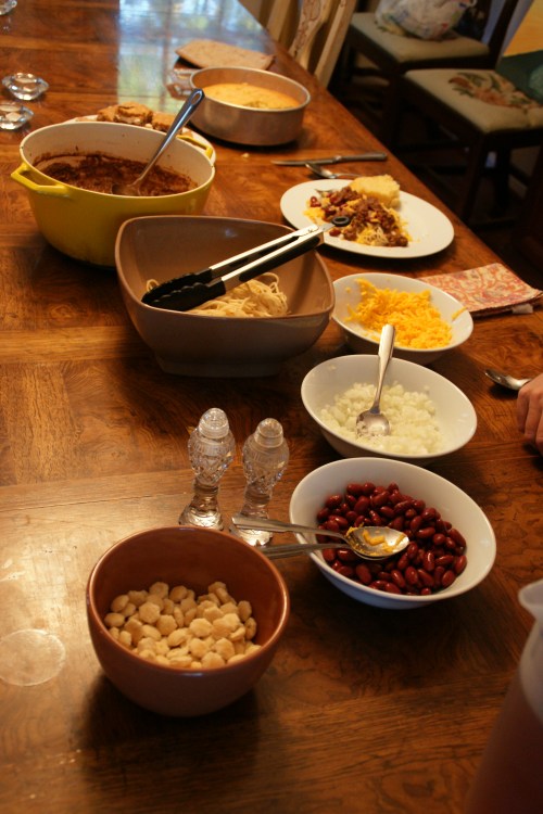 While the chili simmered, I prepared the toppings of grated cheese, chopped onion and a can of rinsed and drained kidney beans. Plus a bowl of oyster crackers for Ken. In the last 30 to 40 minutes of simmering, I boiled the spaghetti and made a round of cornbread (the sweet kind that my guys like). I make mine from scratch, but honestly, you can just use a box of Jiffy.