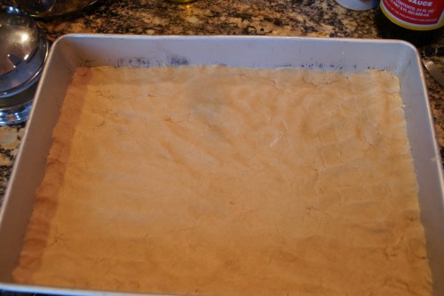 Flour your hands if the dough sticks to them when you touch it, and evenly pat the dough into the pan. Make sure you push it out all the way to the corners since this kind of dough shrinks when you bake it.