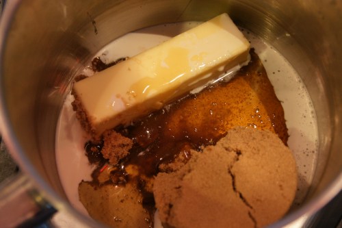 While the crust was baking, I tossed the brown sugar, salt, honey, cream and butter for the filling into a heavy-bottomed saucepan: