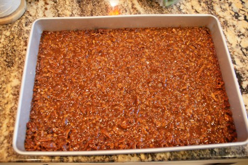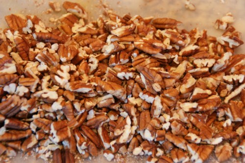 Pour the pecan mixture over the crust and spread it evenly across the surface. I used a plastic spatula.