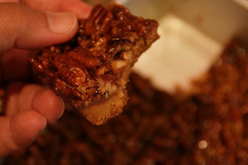 Yet, my Pinterest board was calling my name… I had recently pinned a recipe for Pecan Pie Bars that I thought would be fun for Kurt– he could take them to work! I had a similar pecan bar cookie, but these glistened in their photo and I decided to taste test them. Today. For Kurt. His patience with typhoid Maria.