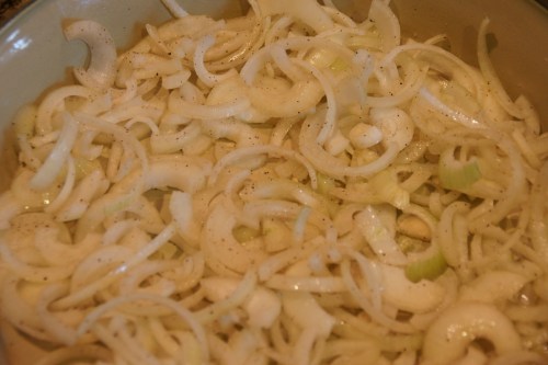 I sliced the onions and broke the slices into rings to spread into the roasting.  I drizzled the onion layer with olive oil, seasoned with salt and pepper, then tossed to combine.