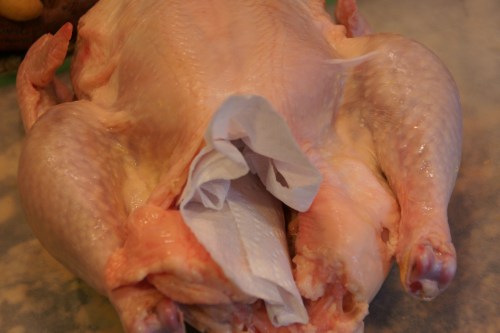 I took the chicken out of the refrigerator and dried off the skin and cavity with a paper towel.  Note: this is the side of the chicken you want face up; the drumsticks are on top (this is the tail end of the chicken) and the wings are in the back on the bottom.  The top of the chicken is the breast.