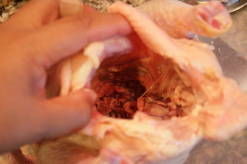Earlier, I had removed the little packet of organs from within the chicken, rinsed out the cavity and body surface, then set it on top of a platter layered with paper towels.  I let the chicken “dry out” in the fridge until I was ready to make dinner.  I do this so the skin will be super crispy (but I have insurance for that as you’ll see later).