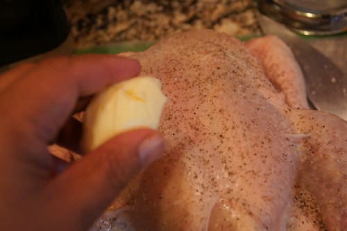 I generously salted and peppered the skin all over, and grabbed a nob of softened butter: