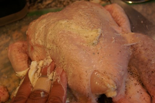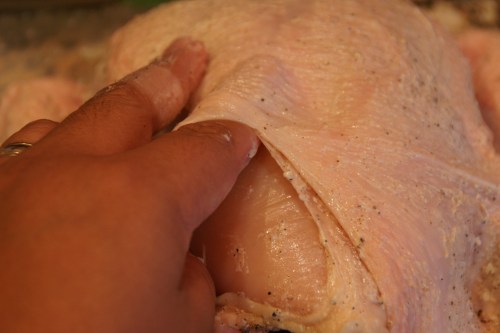 I also separated the breast from the skin and rubbed whatever butter and seasonings I had on my fingers in that space, just to ensure the white meat stays moist: