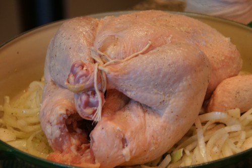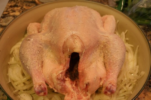 I plopped the bird on top of the onions.