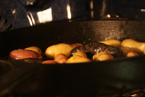 Fingerlings tossed with duck fat, salt and pepper, oven roasting in my favorite cast iron pan