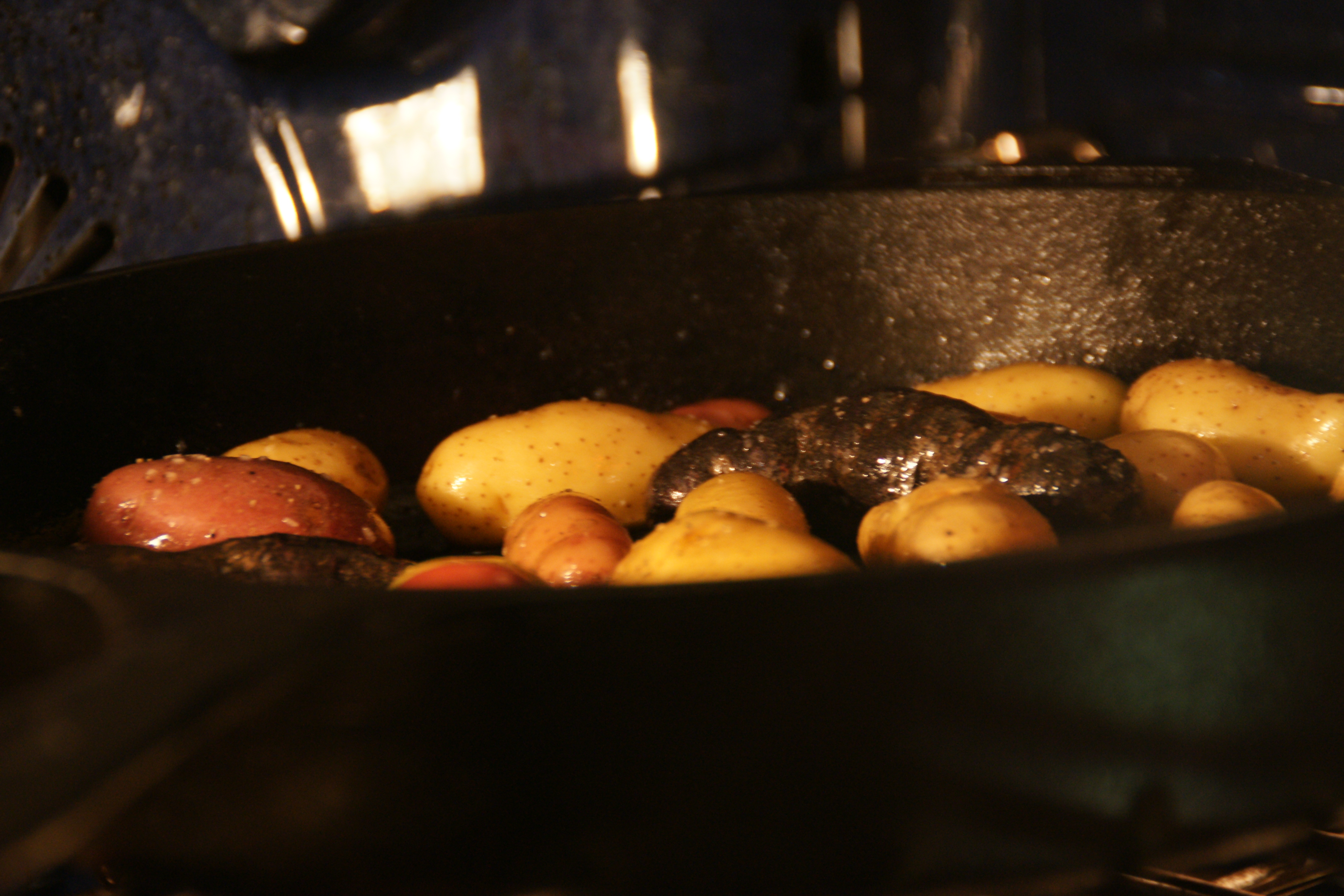 Fingerlings tossed with duck fat, salt and pepper oven roasting in my favorite cast iron pan