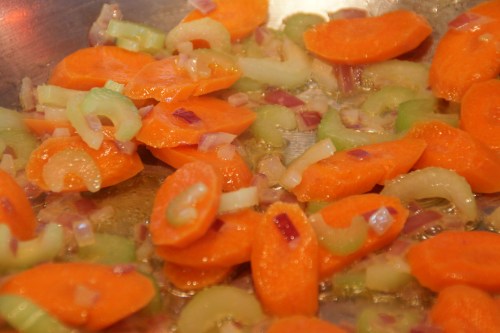 Once the onions have begun to soften, add the carrots and celery and cook until celery is softened: