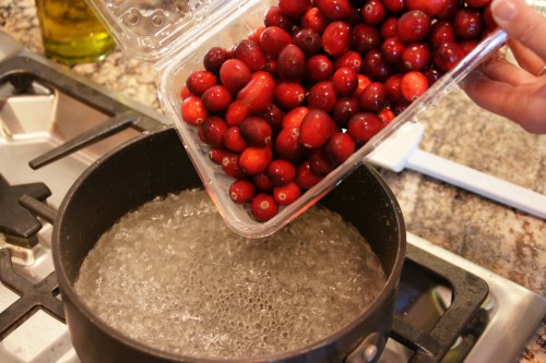 Grace’s cranberry relish is so much better than the canned stuff and very easy to put together (trust me, she doesn’t like to do super-complicated recipes– when we made the s’mores bars, she didn’t want to cream the butter and sugar as it meant getting out the hand mixer).  She was a good sport about letting me take mutliple photos of her cooking, even when I kept telling her she needed to move her hands closer to the boiling cranberry sauce for a better shot!