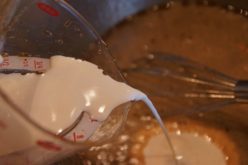 Whisk eggs, add syrups,