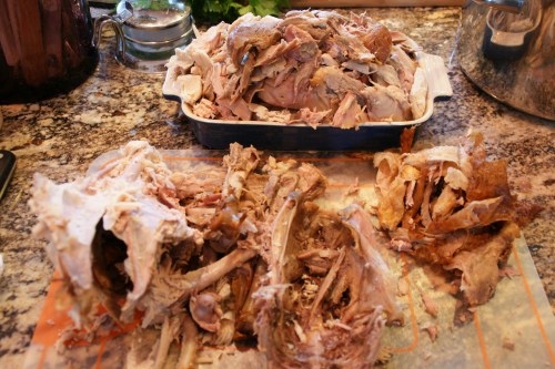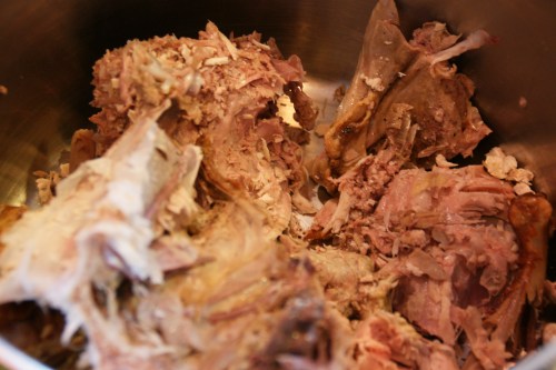 Then, scavenge all the meat you can from the carcass; I also picked the legs and wings which were in another bag: