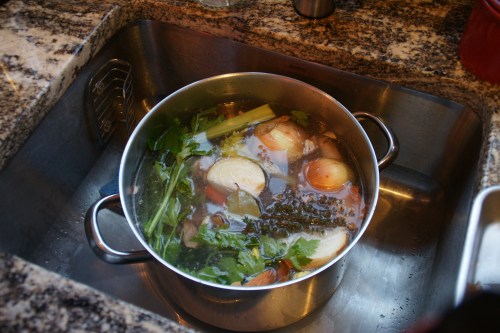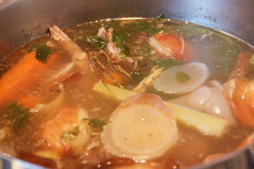 Bring the pot to a boil, then reduce to medium-low to simmer.  Simmer uncovered for 1 1/2 to 2 hours; I’ve gone as short as 1 hr, but it is better to go the full 2 hours.  Add water as needed if the bones and vegetables are overly exposed.