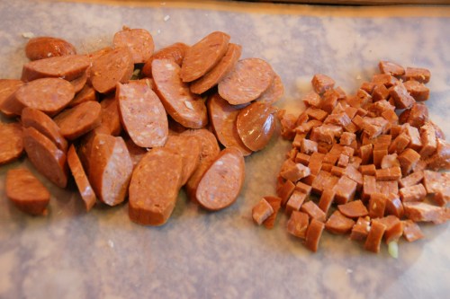 Andouille sausage is a spicy sausage made in Louisiana.  I can rarely find the real thing here, but Wegman’s sells their version and it’s pretty good.  Chop one of the four andouille sausages into a small dice; slice the remaining three on the diagonal.  Beware of tweenie boys on the prowl for “just one slice.”