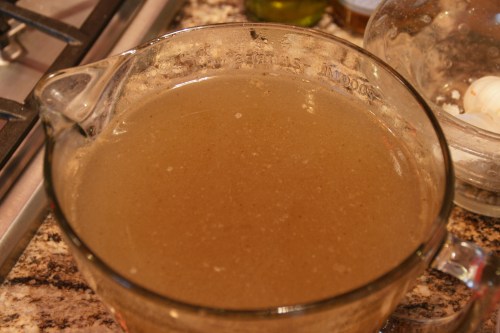 Then I ladle stock through a fine mesh sieve into a quart measuring cup and set it aside.  I freeze the rest.