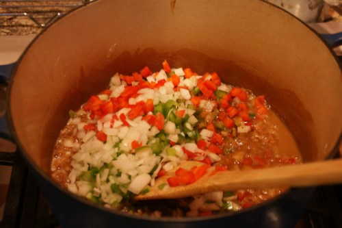 Add the vegetables; they will sizzle.  That’s okay.  Just mix with the roux and let soften.