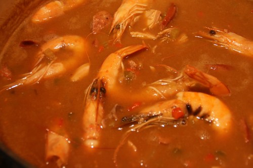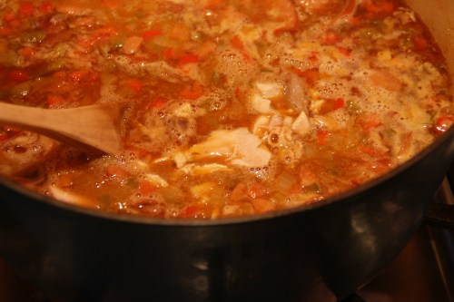 Carol’s mom, Mrs. C., inevitably made gumbo from that carcass.  I didn’t know what gumbo was before our families met and when Mrs. C. served up a bowl of that spicy stew over rice, I was immediately hooked.  She showed me how to make it one year and, like all hand-me-down recipes, she never measured anything.  She taught me about Creole/Cajun cuisine’s “trinity” of onions, green peppers and celery, how to dice some of the andouille sausage to give the stew more texture and how to make a brown roux from oil and flour (and to watch it closely so it doesn’t burn).  She also always added some kind of seafood– shrimp, steamed Maryland crabs cracked in half, or oysters.  Another addition was a box of frozen okra, but I don’t use it because I’m not quite a convert, and Kurt is worse than I.  Lastly, I also veer from the traditional “trinity” and use red pepper with the green.