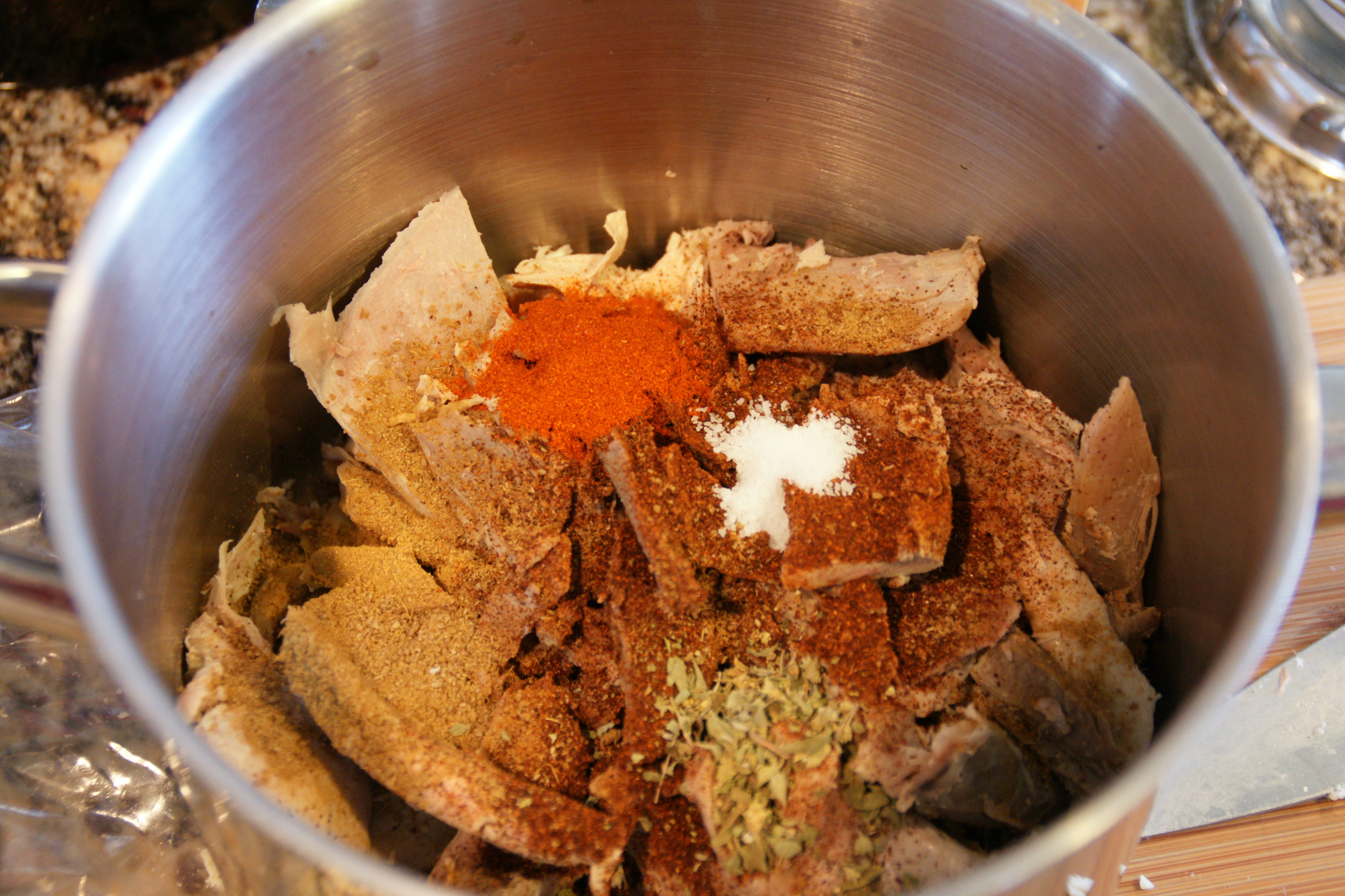 You don’t have to chop the turkey now; it falls apart after simmering with the spices.