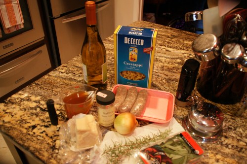 The only real prep is to rinse the herbs, pull the casings off the sausage and chop the onion. I don’t bother to chop it two different ways as the recipe states. I also put a pot of water on to boil.