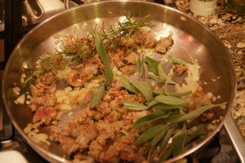 Once I throw the pasta in the pot to cook, I start making the sauce. I heat the oil in a large pan and saute the onion and sausage together. I add the rosemary and sage and cook a little longer, about 5 minutes.