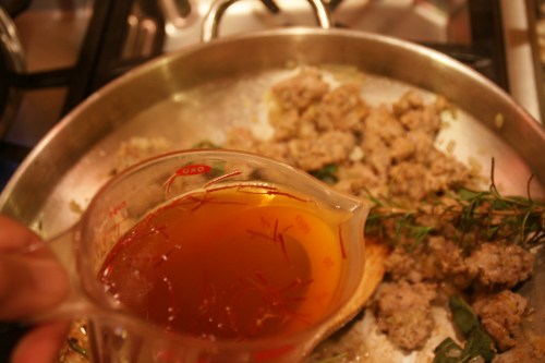 When there is very little wine left, I add the saffron-infused vegetable stock and simmer everything together on medium low heat. The liquids are the sauce; so don’t let them evaporate.