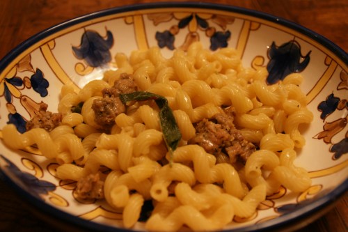 The unique flavor of the dish comes vegetable stock infused with saffron, plus rosemary and sage cooked with the sausage. Saffron will be the difficult item to find; it’s also pricey, but you only need a pinch. I’ve seen little pill box-sized quantities sold in higher end grocery stores. Spanish saffron is the best, but I’ve also used Greek. If you can’t find cavatappi, I think penne would work fine. The only ingredient change I make is the addition of more vegetable stock; I tend to need twice as much to have enough sauce for the pasta.