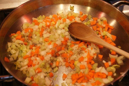 Heat a large saute pan or small dutch oven over medium heat; generously coat the bottom with olive oil. When the oil is shimmering, add the onion, celery and carrots. By the way, since I’ve been randomly throwing around cooking terms throughout my blog, I guess I should let you know the technical term for the celery-onion-carrot trinity is mirepoix. (Yeah, another French term). Season with a little salt and pepper (not too much salt since salt toughens beans).