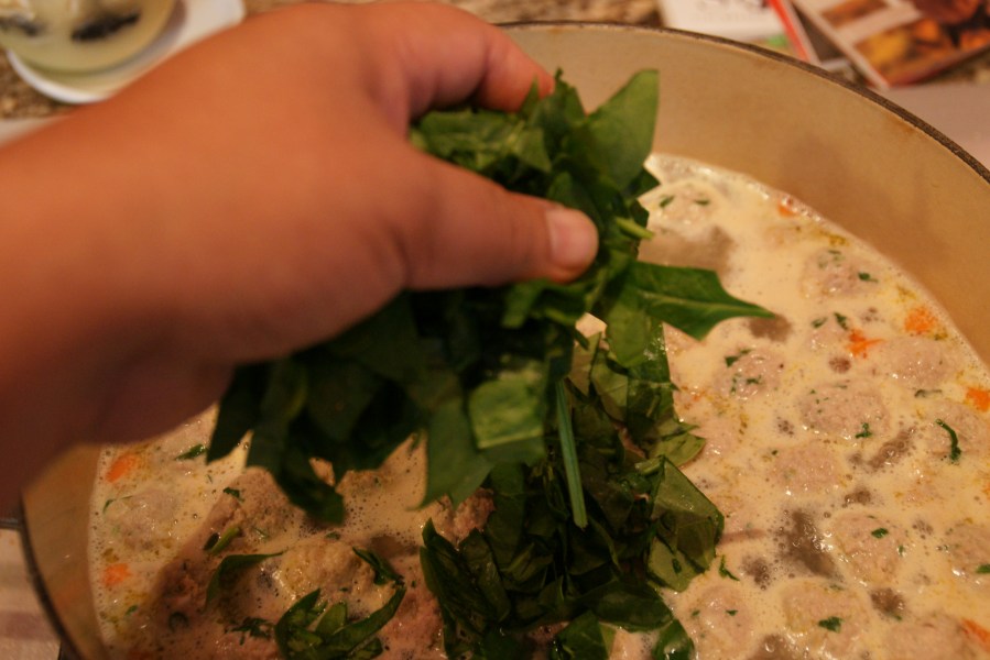 Add by the handfuls, not all at once to maintain the simmer for the pasta.