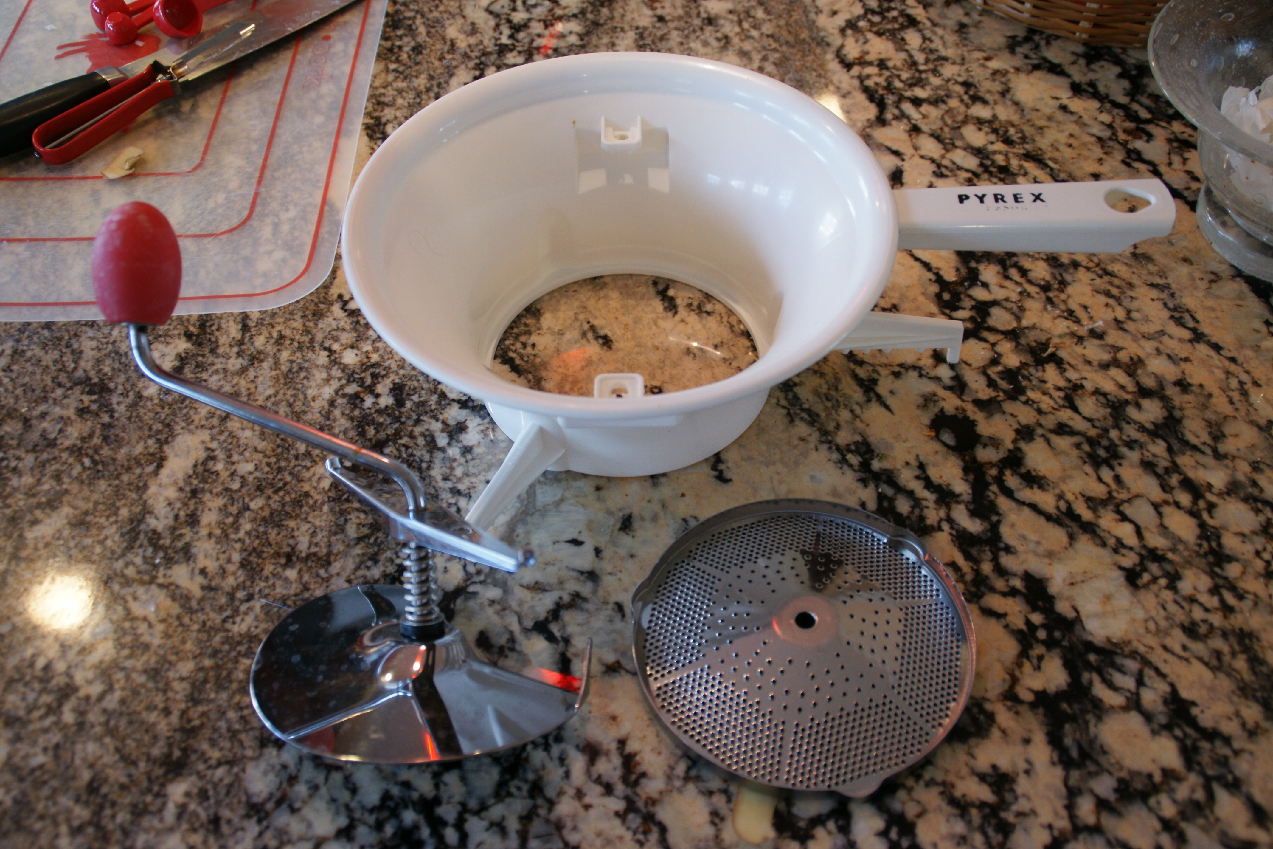 There are three pieces to a food mill- the crank, the bowl and the blade.