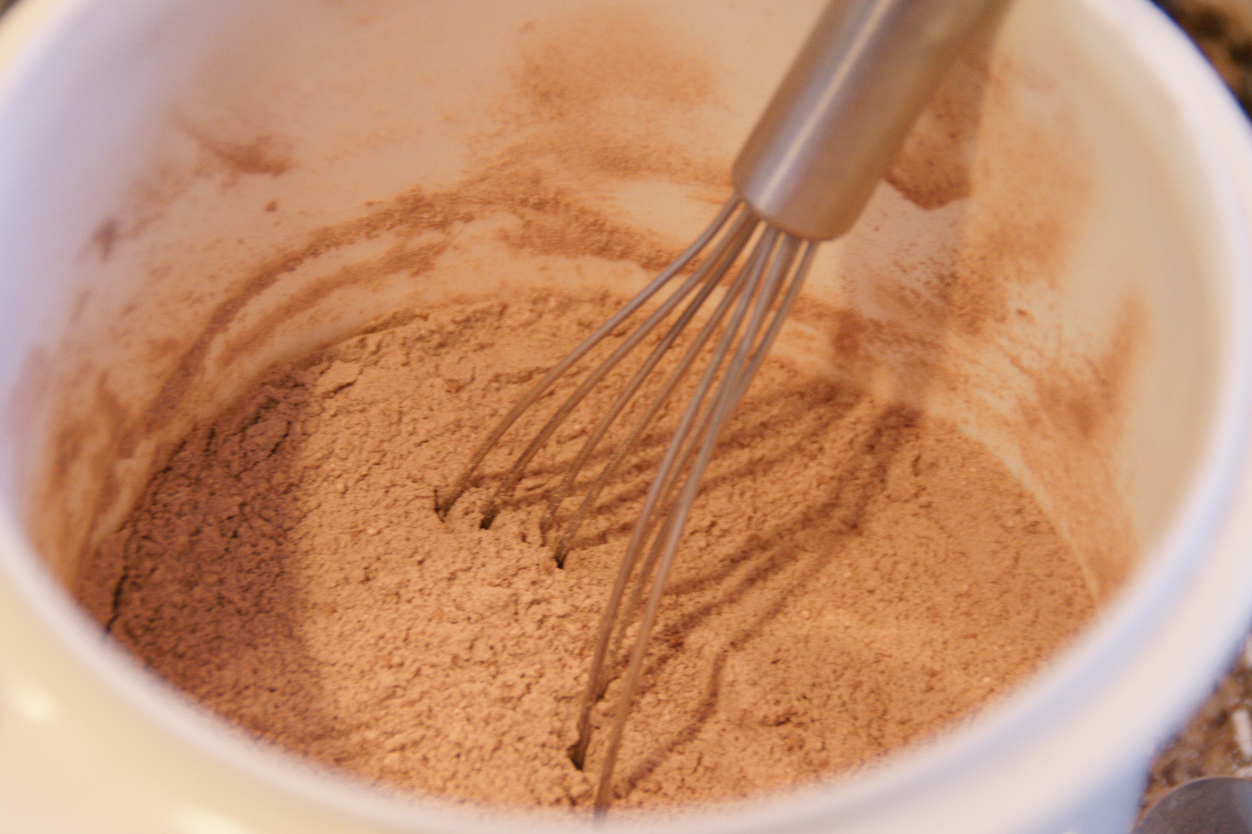I had leftover egg whites which measured just under 1 1/2 cups. I whisked the cake flour, half the sugar, the cocoa and salt in one bowl,