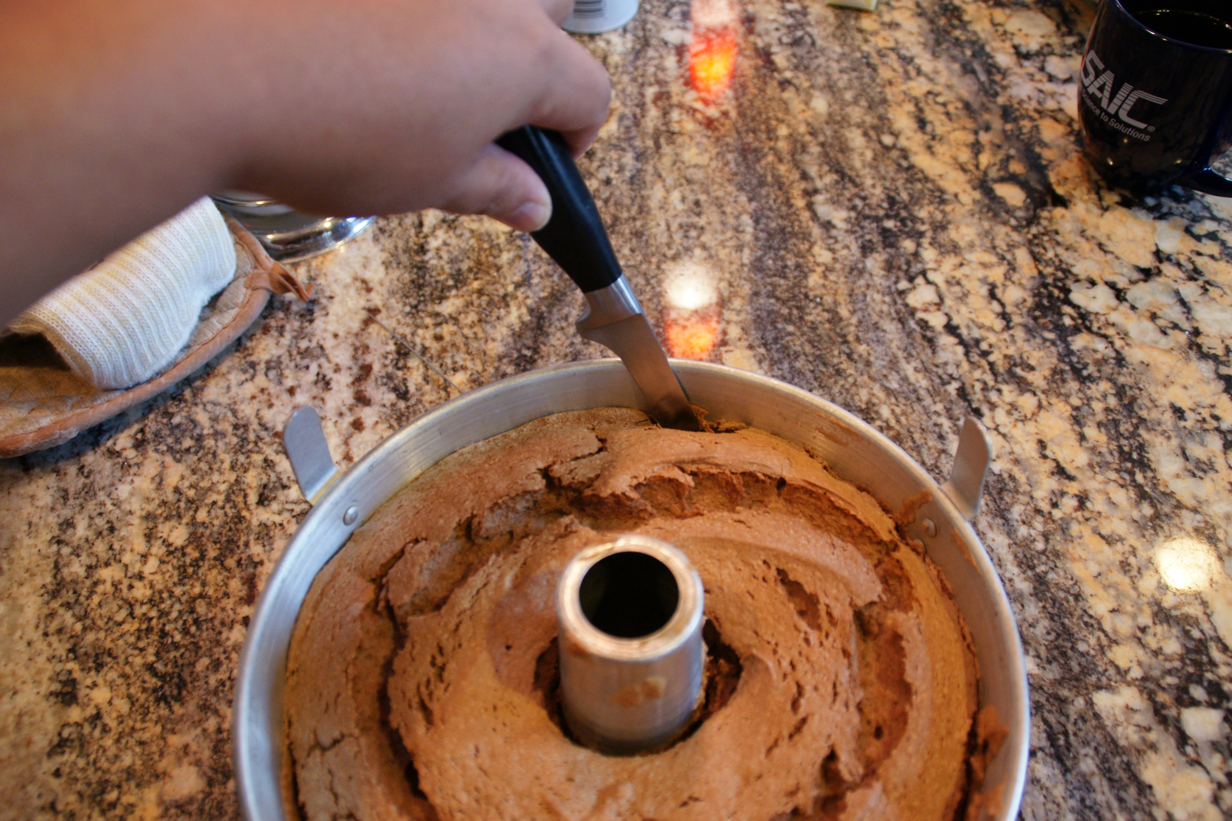 After the cake has cooled, run a thin sharp knife around the edge and core,