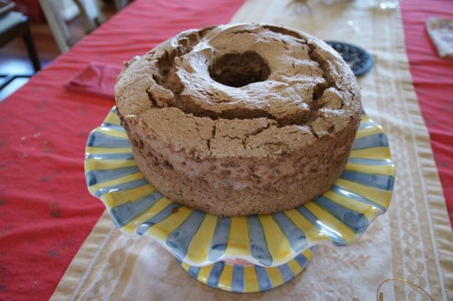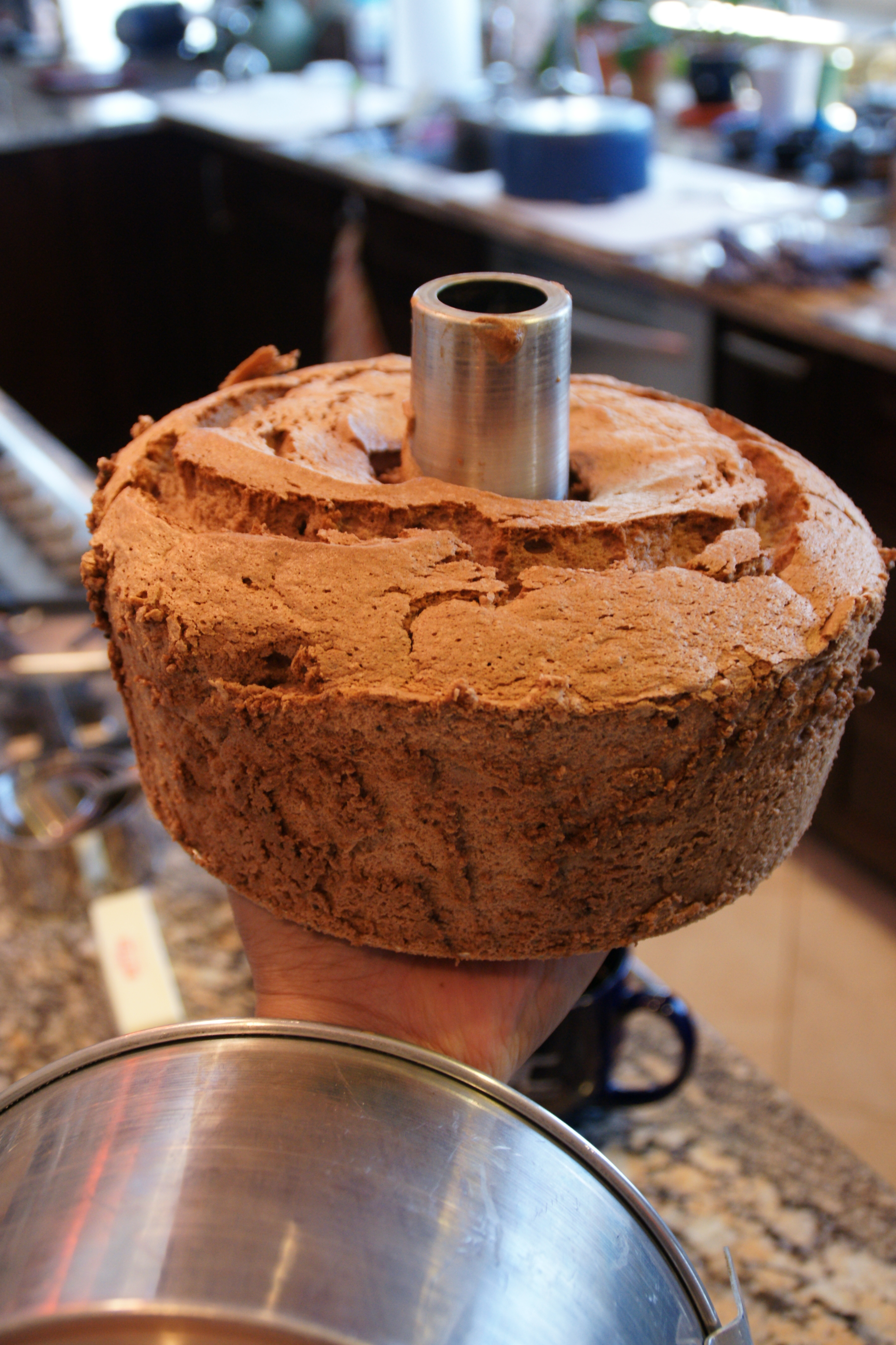 Invert the pan over a wine bottle (my pan has prongs along the rim, so I can just invert mine right on the counter) and let the cake cool, undisturbed, for 1 1/2 hours.