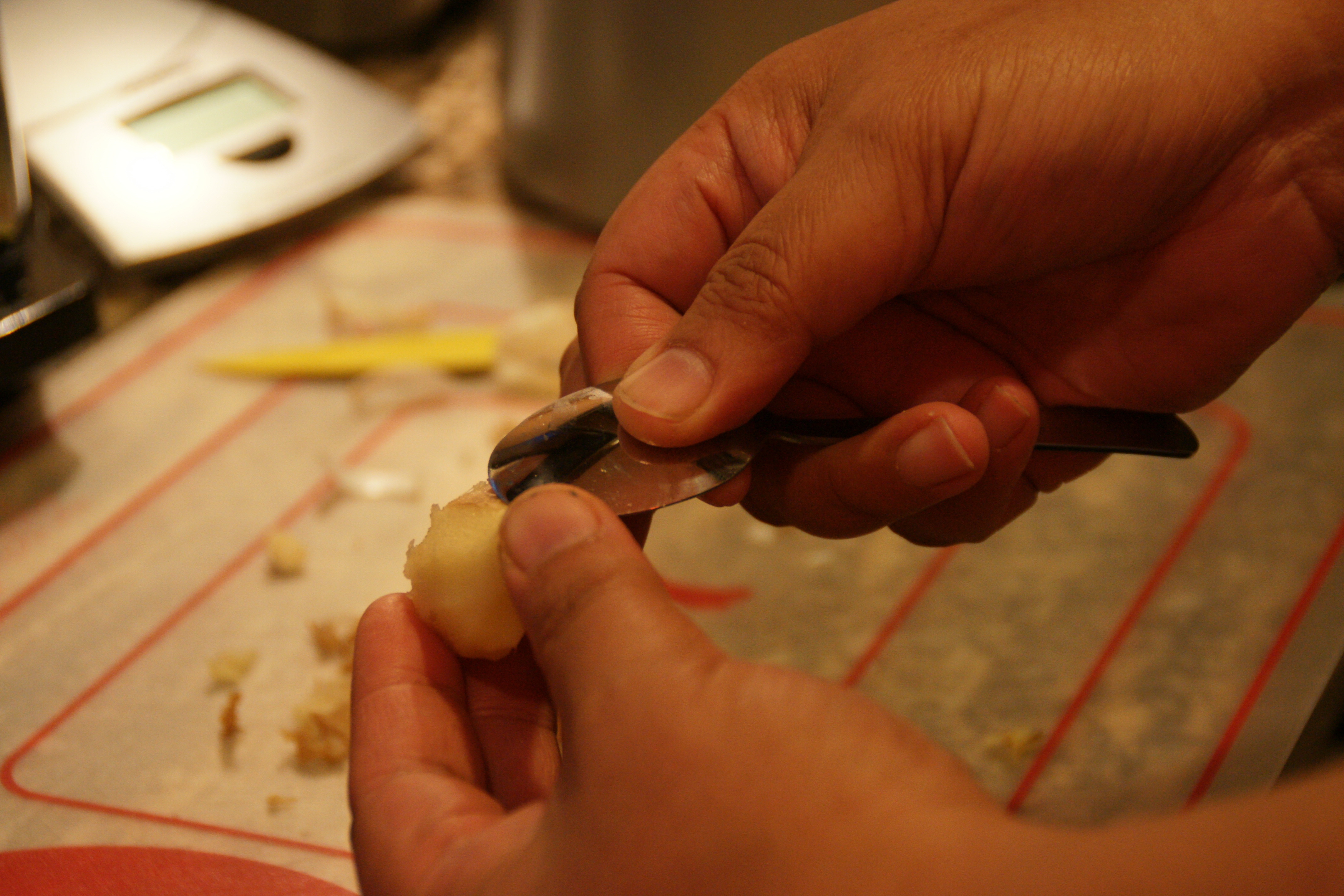 Don’t use a paring knife; that’s too cumbersome.  Instead, use the edge of a teaspoon to scrape the thin peel off.  Fast and easy!