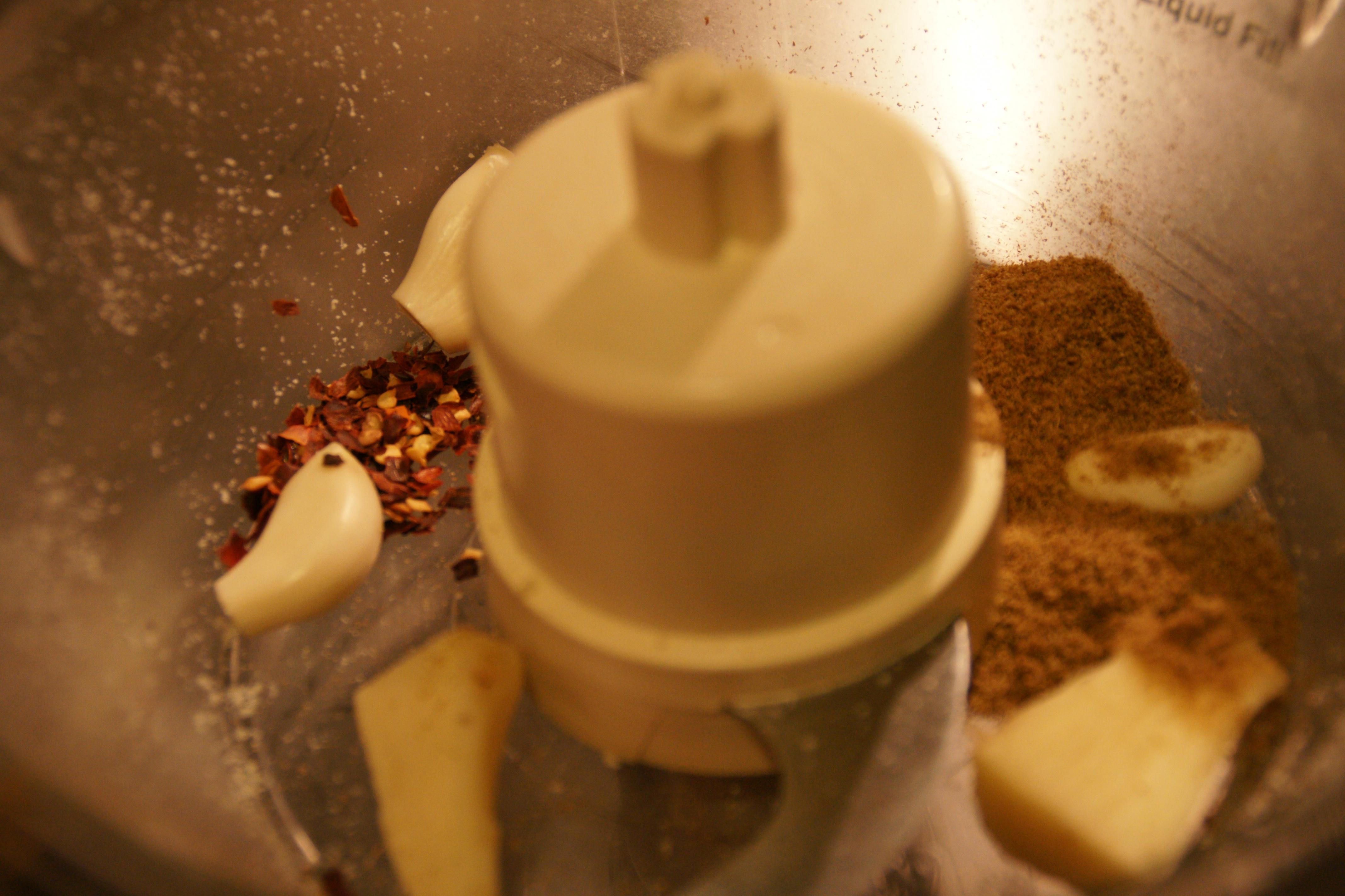 I removed the almonds to a small bowl, then added the ginger, garlic and spices to the work bowl,