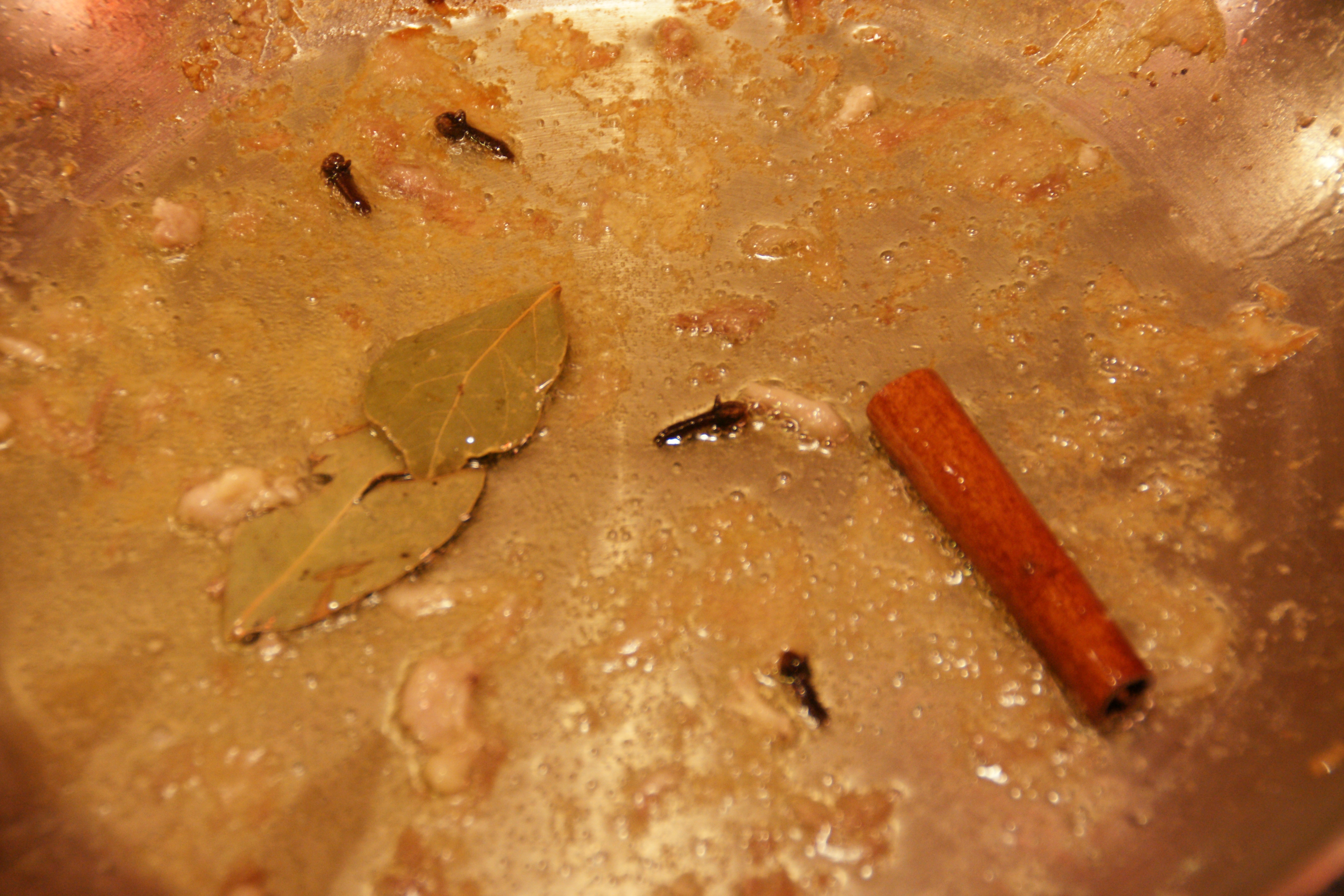 then added the dry spices (cardomom pods, cinnamon stick, bay leaves and cloves) and let them sputter a bit in the oil.