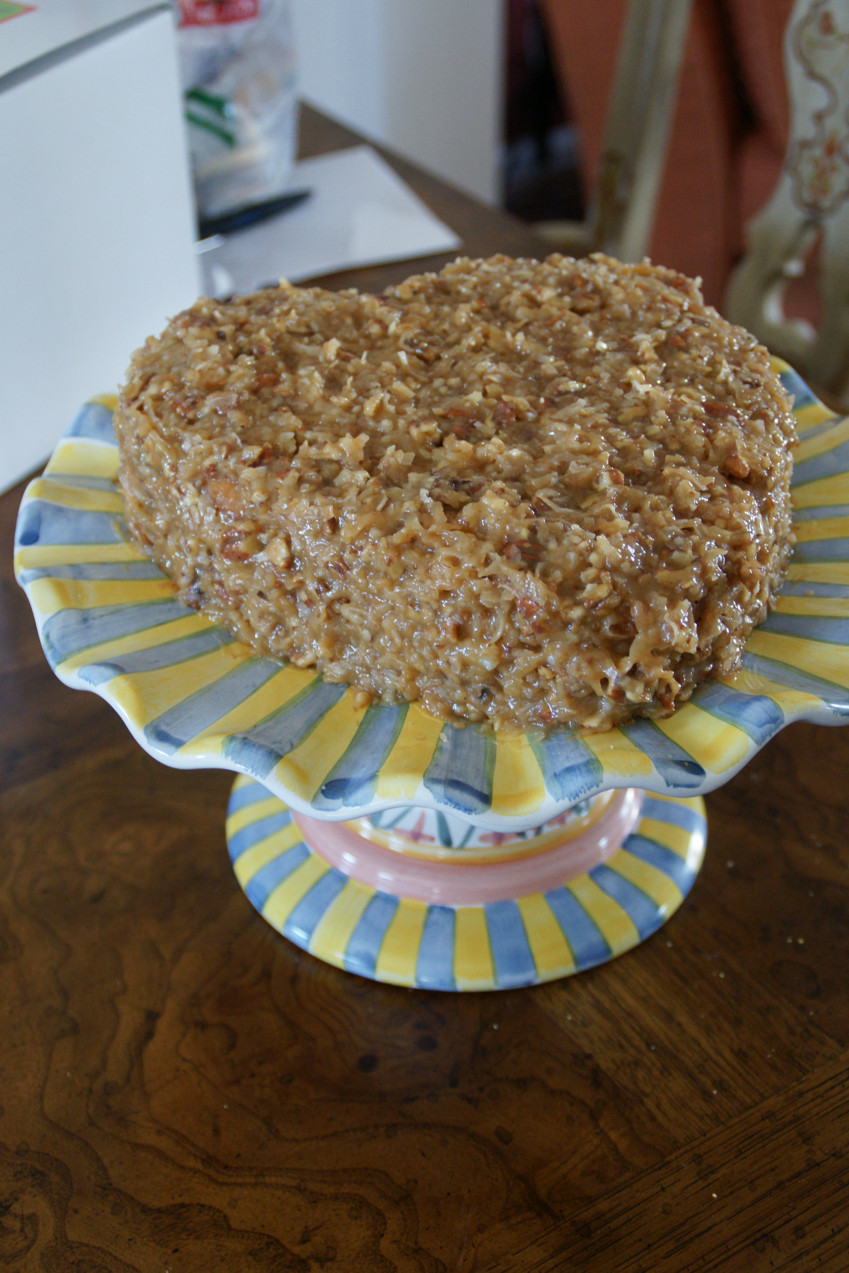 My cake stood in naked glory perched upon its stand this morning.  I hadn’t quite decided how to adorn it when I went to bed, but this morning I remembered a pingback from another blogger.  Her blog collects old-fashioned family recipes and she had added my tapioca pudding recipe as a related recipe.  Her post that day had been for a coconut pecan frosting, and this morning, that appealed to me.  Her recipe uses flaked coconut and chopped pecans; I decided to toast both largely because my husband Kurt has “texture issues” with flaked coconut.  (It’s a long list of who doesn’t like to eat what in my family– flaked coconut, mayonnaise, melons, bananas– it’s a wonder I ever get a menu together for our holiday get-togethers).