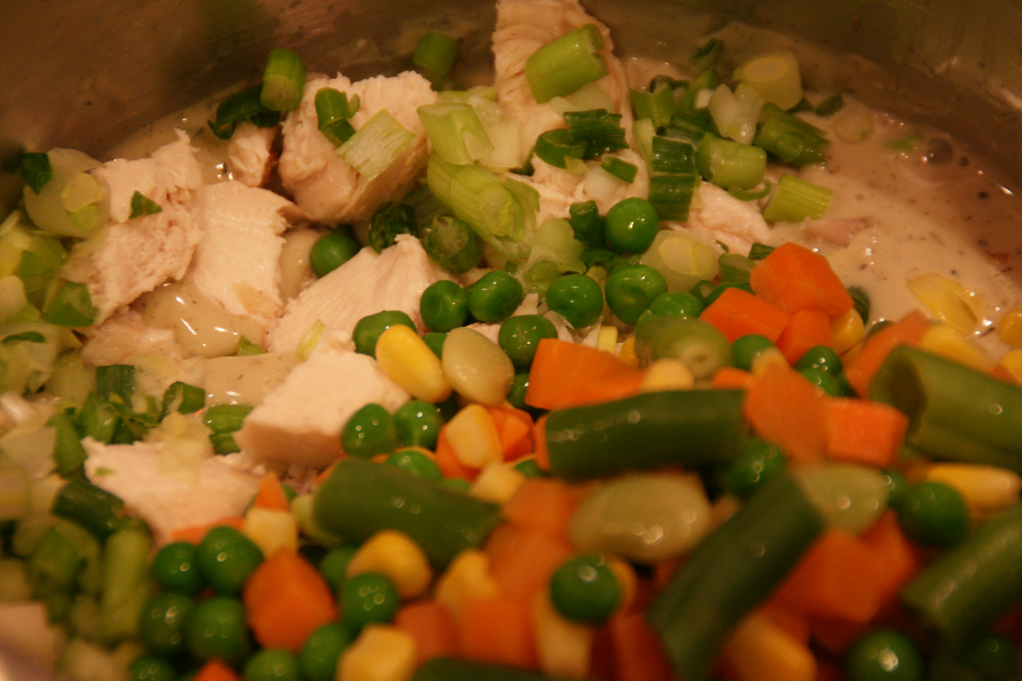 Add the chicken, mixed vegetables, and chopped scallions. Mix well and season to taste with salt and pepper. Set aside and pop open your biscuits.