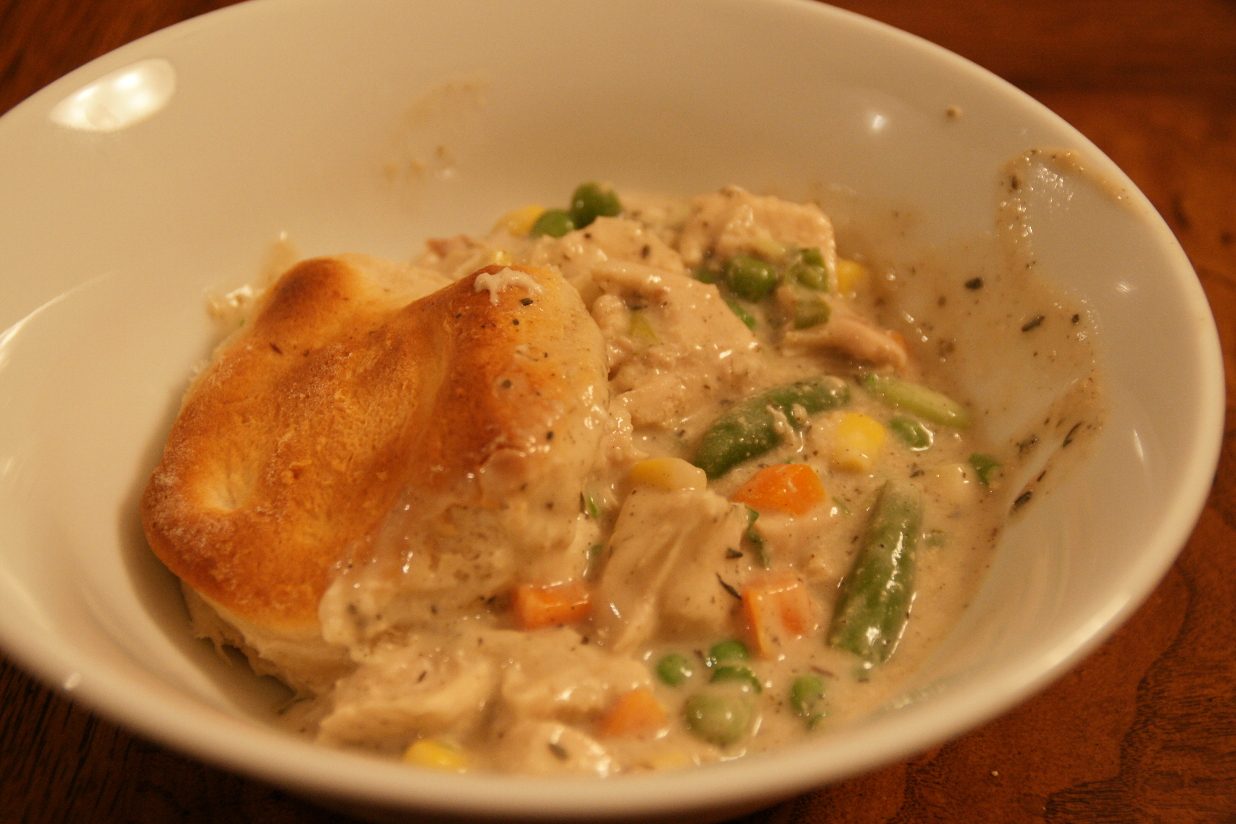 Pour the chicken and vegetables into the casserole, and nestle the biscuits across the top (I used six).