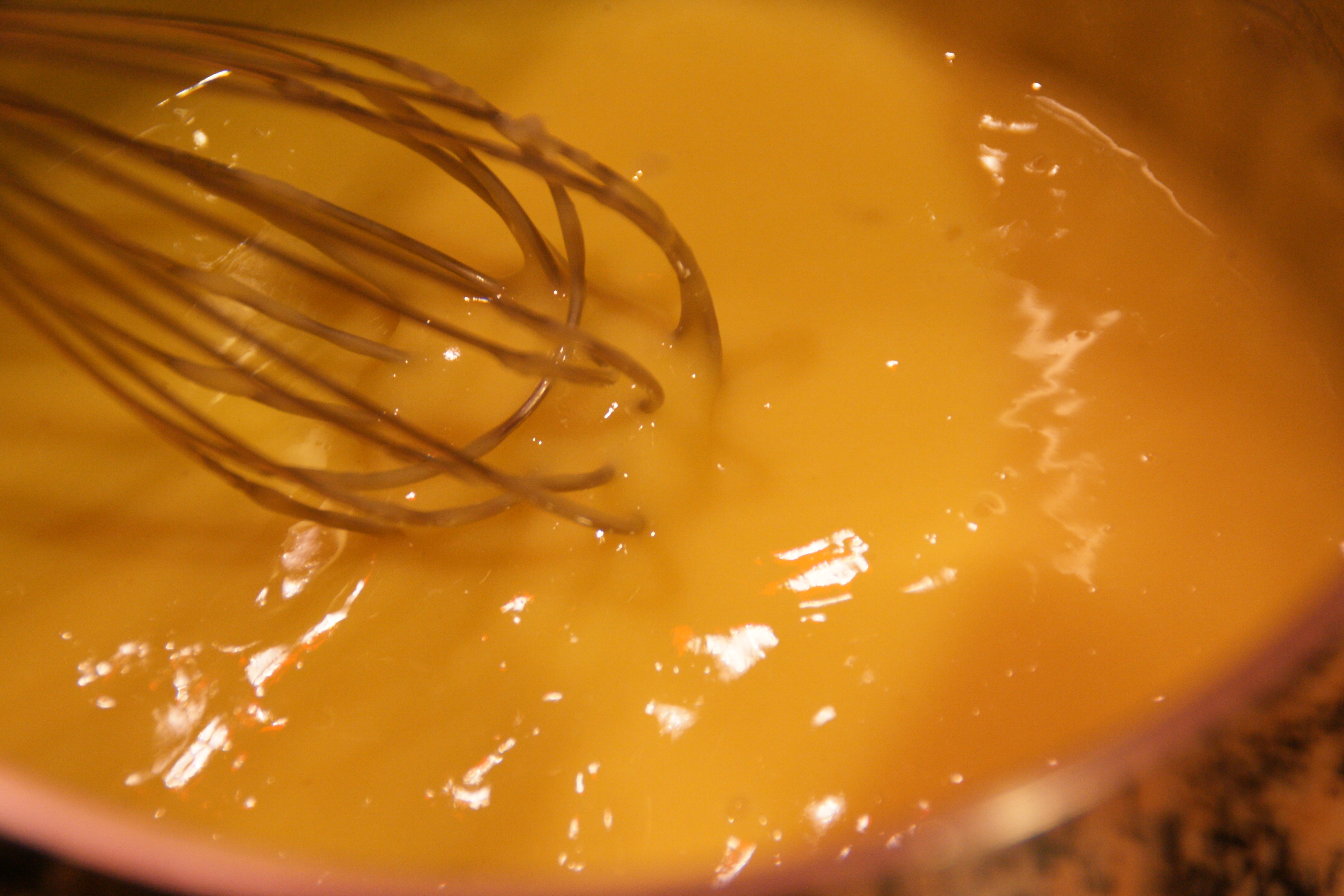 Take the pot off-heat and beat until slightly cooled. Add the egg yolks, approximately one at a time, whisking well after each addition.
