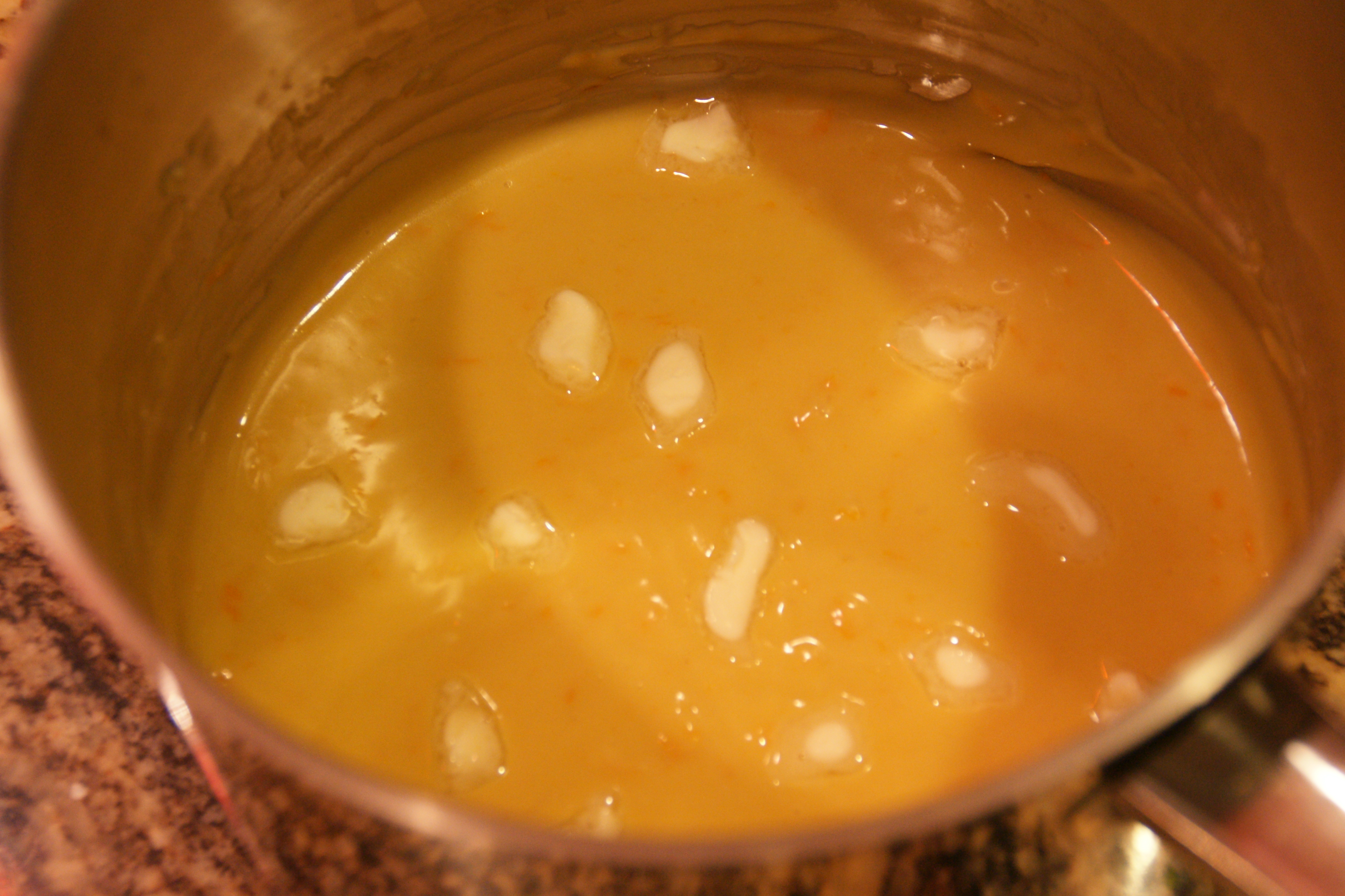 Beat in half the butter, then add the vanilla, orange zest and orange liqueur. Dot the surface with the remaining half to prevent a skin from forming while you beat the egg whites.